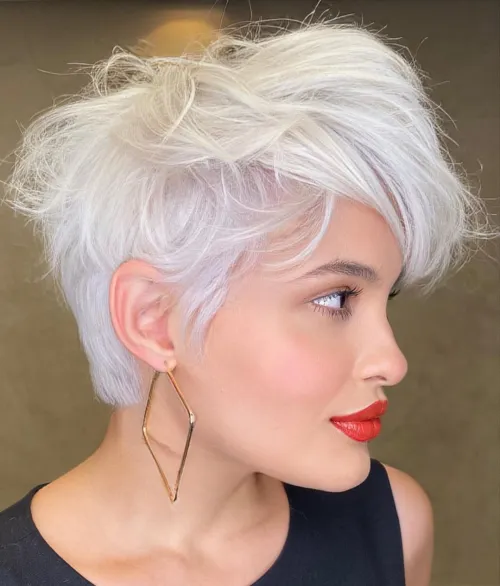 We are truly stunned by this gorgeous, modern pixie hairstyle in bright white tones! A sassy white long pixie cut is a trendy and chic hairstyle that combines the boldness of a pixie cut with a touch of sophistication and flair. This pixie cut allows for various styling options. Messy styling adds texture and movement to the thin hair, boosting its volume at the top. This pixie cut is designed to exude personality and self-assurance, making it a statement hairstyle that stands out. The sassy white long pixie is a contemporary and bold hairstyle that combines the daring nature of a pixie cut with a touch of sophistication and modernity through the longer length and trendy white color. It’s a choice for those who want a statement look that reflects confidence and style.