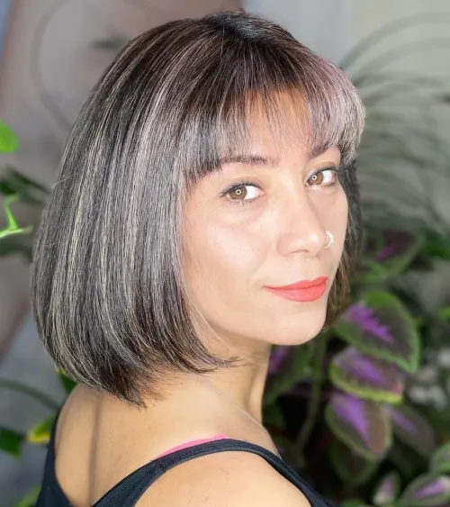 If you have straight short hair packed in a classic bob, a mix of gray hair colors with lighter shades will significantly brighten up your look. The bob is characterized by its straight and clean lines, providing a polished and sophisticated look. Wispy bangs are incorporated into the style, adding a soft and feminine touch. A sleek gray bob with wispy bangs is a stylish and modern hairstyle that can complement various face shapes and personal styles. Blended silver highlights bring more shine and dimension to your mane, drawing more attention to your new short haircut. This hairstyle is versatile and can be adapted to suit different preferences and face shapes, making it a popular choice for those who want a contemporary and sophisticated look.
