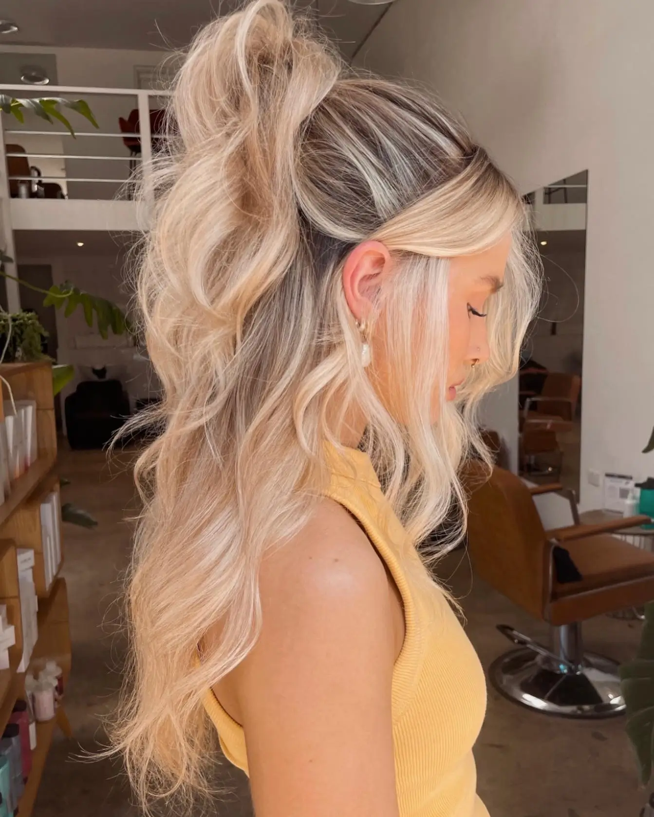 A half up half down ponytail is a versatile and stylish hairstyle that combines the elements of a traditional ponytail and a half-up hairstyle. This hairstyle is achieved by pulling the top half of the hair up and securing it with a hair tie or elastic band, leaving the bottom half of the hair down. It’s a great choice for those who want to show off their hair length while still keeping their hair out of their face, and it’s a versatile hairstyle that can be customized to suit any hair type or texture.