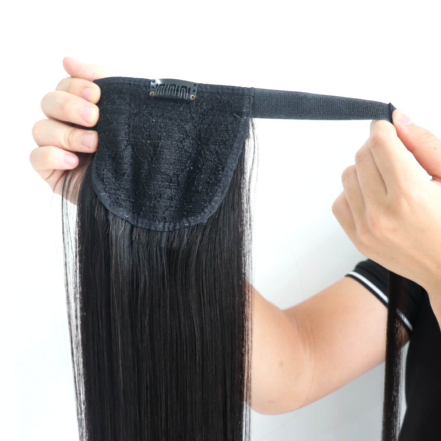 Hair ponytail extensions come with a velcro base to secure the extension around your natural ponytail, and an attached section of hair that wraps around the base to conceal the piece seamlessly. It’ll be our little secret.