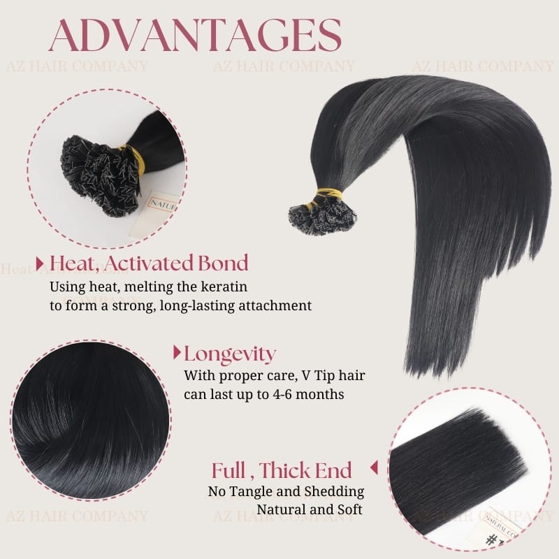 – V tip extensions made from 100% human hair can be curled, straightened, or styled with heat tools like your natural hair.