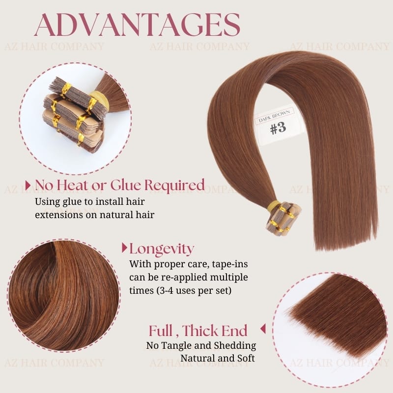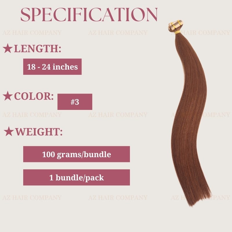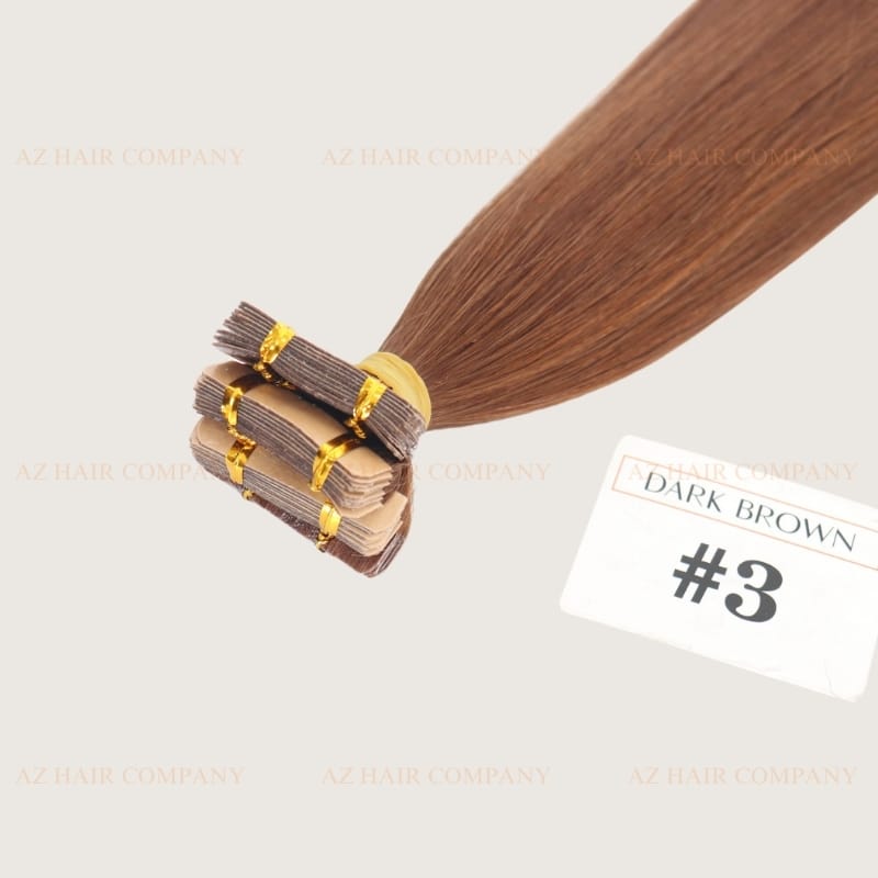 Tape-In Hair Extensions in color #3 are a rich, dark brown shade that exudes elegance and sophistication. Made from 100% premium Vietnamese hair, these extensions feature a double-drawn ratio, ensuring consistent thickness from root to tip for a full-bodied, voluminous look. The lightweight tape design offers a seamless and comfortable fit, blending naturally with your hair. Perfect for adding length, volume, or enhancing your style, these extensions provide a flawless, polished finish for any occasion.