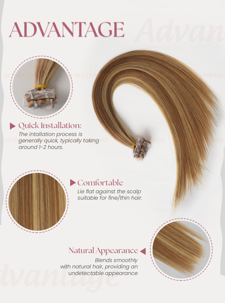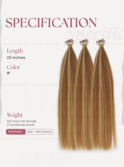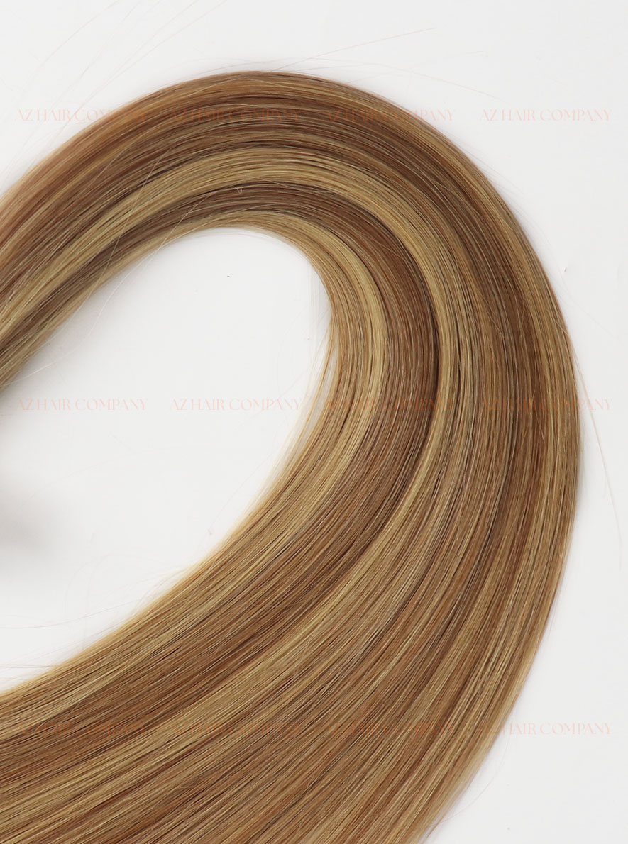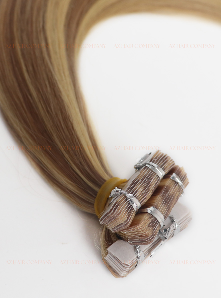 Enhance your hair with our Invisible Tape-in Hair Extensions Premium Quality Highlight 613/5, crafted from 100% high-quality Vietnamese human hair. These premium tape-in extensions feature a striking highlight blend of light golden blonde (#613) and medium brown (#5), creating a radiant, multidimensional look that adds both warmth and contrast to your hairstyle. Perfect for those who love a sun-kissed, effortlessly chic style, this color combination flatters warm and neutral skin tones, bringing out a natural glow and modern elegance in every strand.