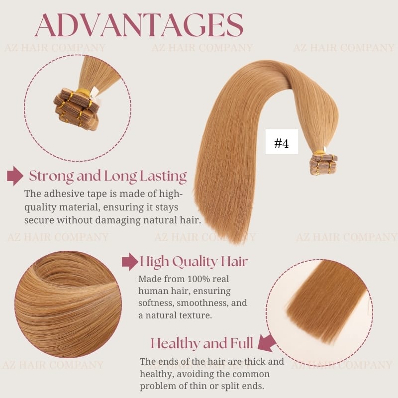 Tape-in Hair Extension #4 is a premium-quality hair extension designed for seamless blending and a natural look. The silky smooth texture and warm brown shade (#4) enhance your hair’s volume and length without damage. Made from 100% Remy human hair, these extensions can be styled, curled, or straightened for versatile looks. The lightweight and reusable design makes them a favorite for effortless, everyday glam.