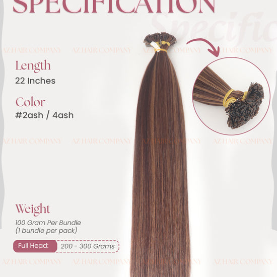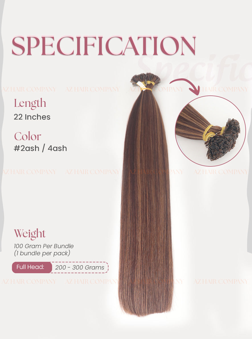 Flat Tip Hair Extensions in Color Highlight (#2ash/4ash) – A luxurious cool ash highlight effect that looks natural, sophisticated, and ultra-trendy, giving the impression of professionally dyed hair. The hair is colored in a true ash tone that is long-lasting and resistant to yellowing over time. Made from premium Vietnamese Remy hair with secure, comfortable, and durable Flat Tip Keratin bonds, these extensions are the perfect choice for clients who want a fashionable, on-trend hairstyle while maintaining a completely natural look.