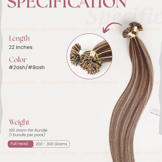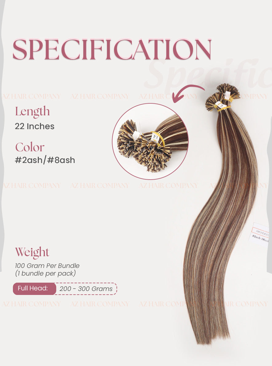 Elevate your hairstyle with Highlight (#2ash/8ash) Flat Tip Hair Extensions — a refined blend of deep ash brown (#2ash) and light ash brown (#8ash), creating a cool-toned highlight effect that is trendy, elegant, and beautifully natural. The soft ash gradient adds depth, brightness, and a modern finish that aligns perfectly with international hair color trends. The Flat Tip Keratin bonds are designed to lie flat against the scalp, ensuring a comfortable fit and a flawlessly seamless blend with natural hair.With factory-direct wholesale pricing, you get consistent, reliable quality that salons and professional buyers can trust.