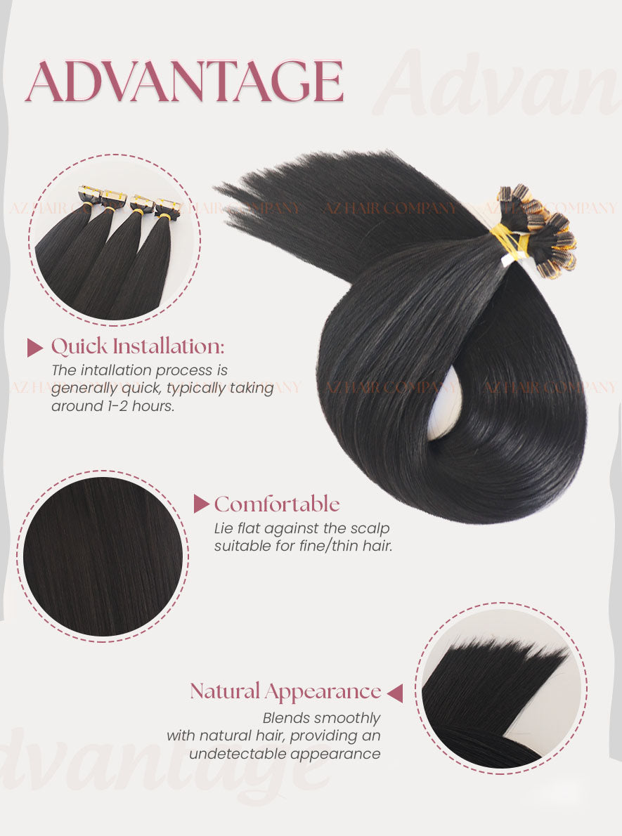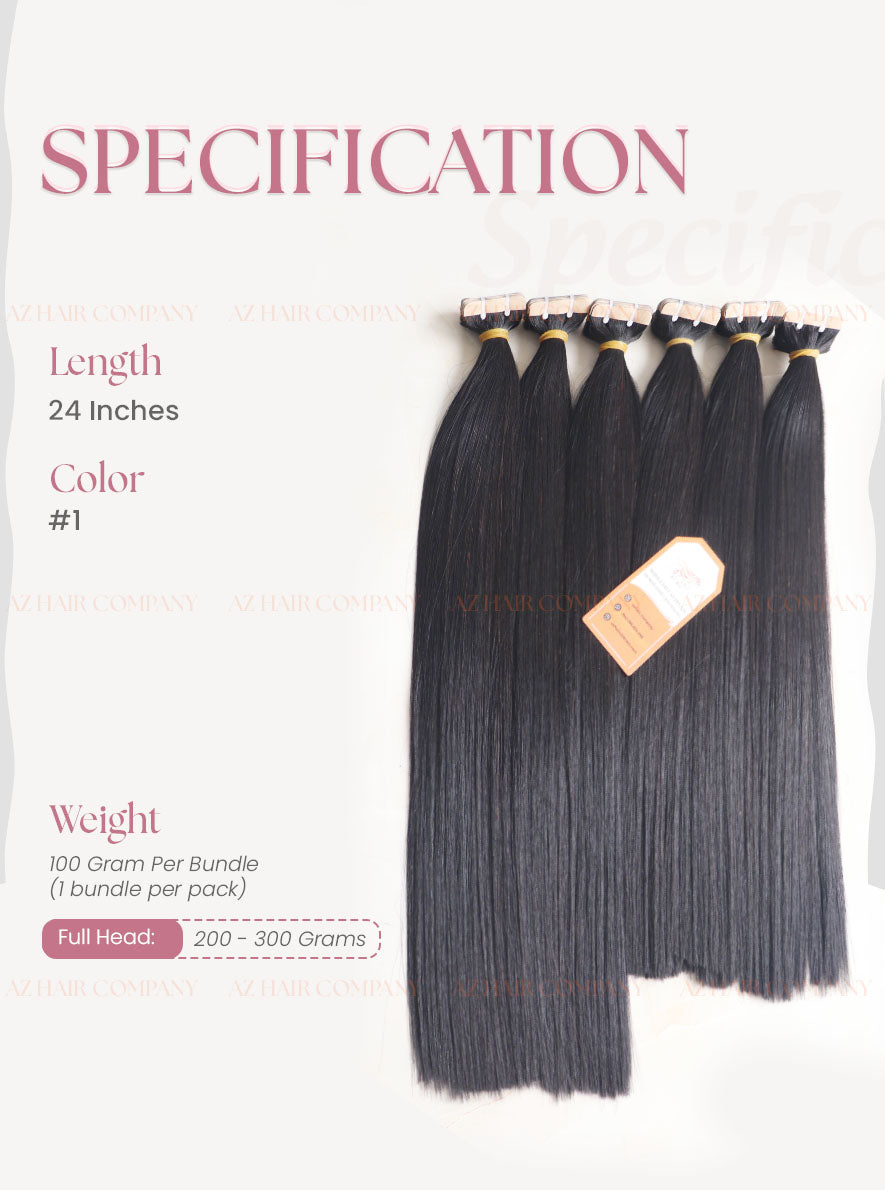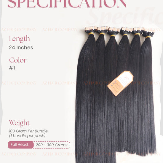 Experience the perfect blend of luxury and practicality with our 24-inch A+++ Jet Black Tape-In Extensions – the ideal choice for those seeking volume and length with a seamless, natural finish. Designed to give you unparalleled length, volume, and a flawless, natural appearance, these extensions are crafted from 100% premium Vietnamese human hair. The deep, lustrous jet-black color adds striking elegance and complements a variety of hair types and styles. Perfect for both everyday wear and special occasions, these extensions blend flawlessly for a truly undetectable look.