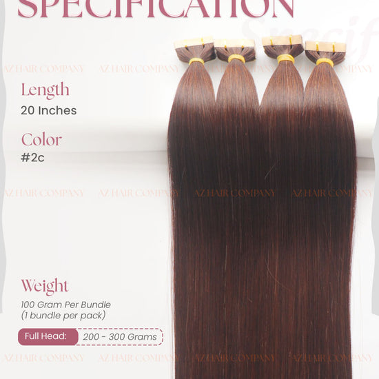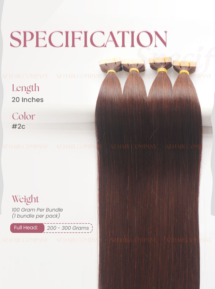 Tape-In Hair Extensions in color #2C are a rich, dark brown shade that exudes elegance and sophistication. Made from 100% premium Vietnamese hair, these extensions feature a double-drawn ratio, ensuring consistent thickness from root to tip for a full-bodied, voluminous look. The lightweight tape design offers a seamless and comfortable fit, blending naturally with your hair. Perfect for adding length, volume, or enhancing your style, these extensions provide a flawless, polished finish for any occasion.