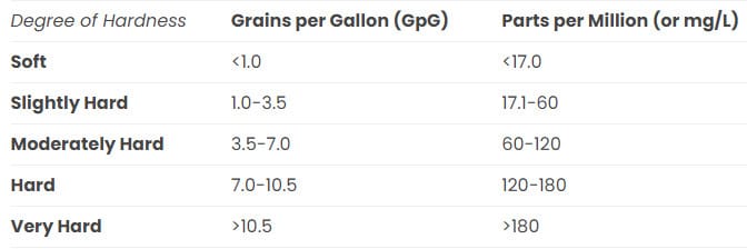 → You’ll see water hardness reported through two different scales: grains per gallon (GpG) and parts per million (PPM), which may also be represented as milligrams per liter (mg/L). Each scale indicates the mineral level in your water. The higher the number, the harder the water. You can use the chart above to find out the hardness of water.