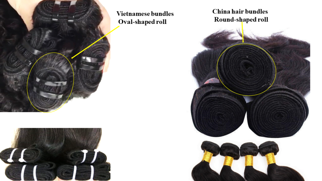 Vietnamese and Chinese hair can be distinguished by the TIE ROLL IN THE HAIR BUNDLES. In Vietnamese and Chinese hair manufacturers, hair bundles are rolled in a variety of methods. As a result, this is one of the most visible differences between Vietnamese and Chinese hair bundles. You can see clearly from the picture above that Chinese hair factories roll each hair bundle into a round-shaped roll while Vietnamese hair factories roll each hair bundle into an oval-shaped roll.