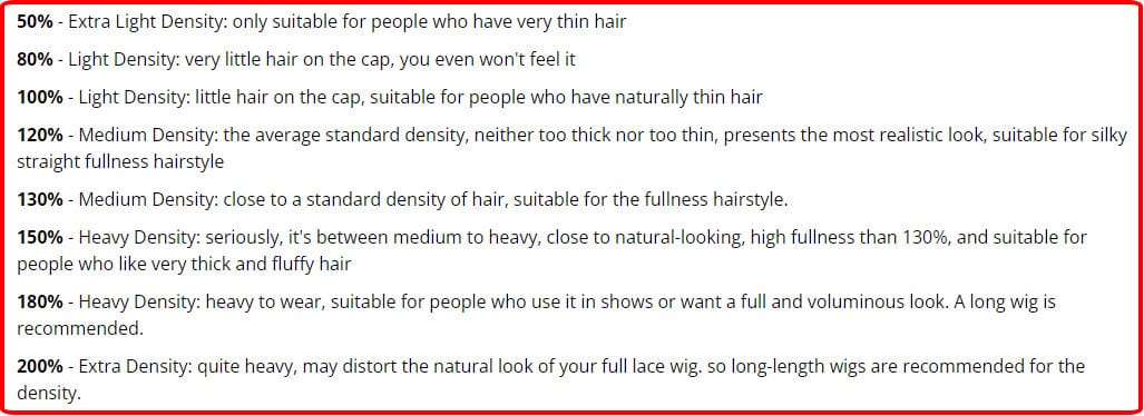 When it comes to the ideal density, there isn’t one that is superior to another. It all comes down to the look you want to achieve. If you want more fullness, you’ll probably go with a higher density, such as 150% or higher. Here are a few things to consider when deciding what density is best for you if you want to choose the perfect density: